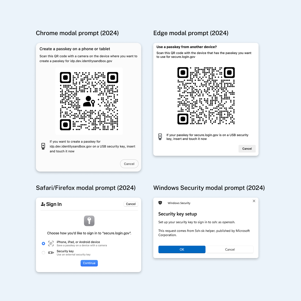 Chrome and Edge lead with a QR code, prompting users to scan it with their mobile device. The security key icon and text is diminished in these examples, adding to user confusion and making it less likely that they will be successful in setting up a security key.