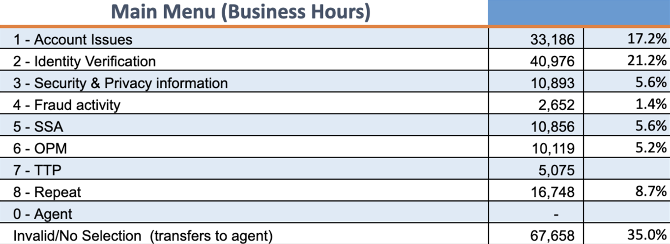 Login.gov Contact Center data revealed that nearly half of incoming calls bypassed automated support and required live agents. This created failure demand or situations where users reached human support not because their issue was complex, but because earlier service touchpoints failed to guide them correctly.